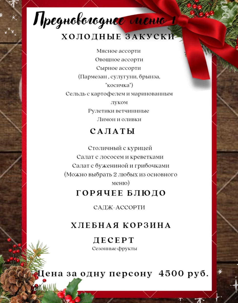 Вся информация о меню в картинке. В эту цену входит меню, шоу программы, дискотека, подарки и т.д. Алкогольные и безалкогольные напитки вы можете принести с собой. Цена: 4 500.00 ₽Добавить в корзину