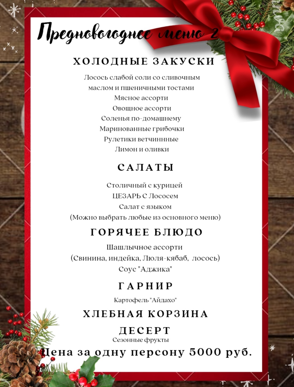 Вся информация о меню в картинке. В эту цену входит меню, шоу программы, дискотека, подарки и т.д. Алкогольные и безалкогольные напитки вы можете принести с собой. Цена: 5 000.00 ₽Добавить в корзину